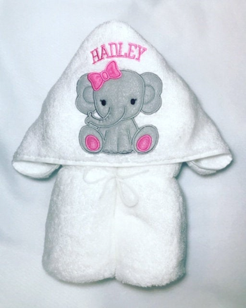 This is a full size bath towel, measuring 32"x54", with an added embroidered hood featuring a baby girl elephant. Great for kids of all ages! Fun for bath time, poolside, or beach! Awesome birthday or baby shower gift and even pool party favors!