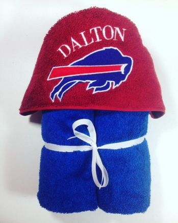 This is a full size bath towel, measuring 32"x54", with an added embroidered hood featuring Buffalo Bills. Great for kids of all ages! Fun for bath time, poolside, or beach! Awesome birthday or baby shower gift and even pool party favors!