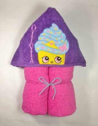 This is a full size bath towel, measuring 32"x54", with an added embroidered hood featuring Shopkins Cupcake. Great for kids of all ages! Fun for bath time, poolside, or beach! Awesome birthday or baby shower gift and even pool party favors!