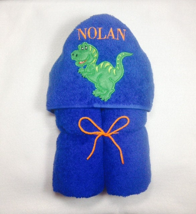 This is a full size bath towel, measuring 32"x54", with an added embroidered hood featuring a dino. Great for kids of all ages! Fun for bath time, poolside, or beach! Awesome birthday or baby shower gift and even pool party favors!