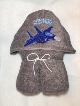 This is a full size bath towel, measuring 32"x54", with an added embroidered hood featuring a fighter jet. Great for kids of all ages! Fun for bath time, poolside, or beach! Awesome birthday or baby shower gift and even pool party favors!