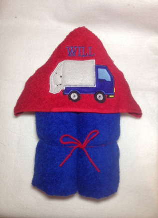 This is a full size bath towel, measuring 32"x54", with an added embroidered hood featuring a garbage truck. Great for kids of all ages! Fun for bath time, poolside, or beach! Awesome birthday or baby shower gift and even pool party favors!