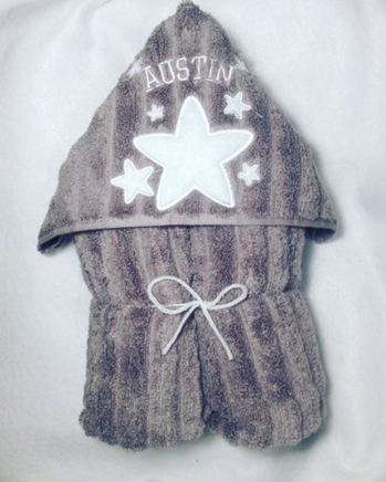 This is a full size bath towel, measuring 32"x54", with an added embroidered hood featuring Stars. Great for kids of all ages! Fun for bath time, poolside, or beach! Awesome birthday or baby shower gift and even pool party favors!