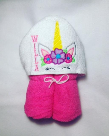 This is a full size bath towel, measuring 32"x54", with an added embroidered hood featuring a unicorn. Great for kids of all ages! Fun for bath time, poolside, or beach! Awesome birthday or baby shower gift and even pool party favors!
