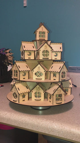 Fully Assembled Christmas Advent Calendar. 25 Beautiful wooden houses on a 4 tier wooden base. Each one is numbered and has removeable roof for you to put treats in. You can even put led lights in them to make it even more beautiful. The houses are not attached to the base so you can arrange them how you want. You can even paint them if you would like.